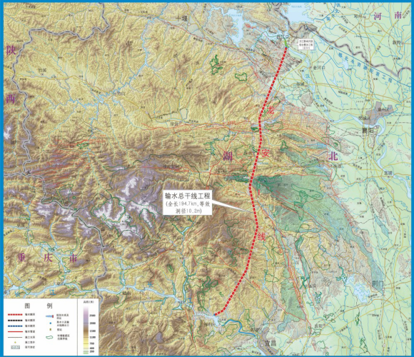 引江補(bǔ)漢工程作為南水北調(diào)中線后續(xù)水源工程,從長(zhǎng)江三峽庫(kù)區(qū)引水入漢江,沿線由南向北依次穿越宜昌市夷陵區(qū)、襄陽(yáng)市??悼h、谷城縣和十堰市丹江口市。主要包括輸水總干線工程和漢江影響河段綜合整治工程,為有壓?jiǎn)味醋粤鬏斔?,多年平均調(diào)水量為39億立方米,引水流量隨三峽水庫(kù)水位變化為170~212立方米每秒。工程施工總工期108個(gè)月,工程靜態(tài)總投資551.58億元。