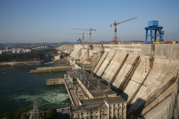 丹江口大壩加高工程位于湖北省丹江口市境內(nèi)漢江干流與其支流丹江匯合口下游800米處,是在原有壩體上進(jìn)行混凝土培厚加高,包括混凝土大壩加高和心墻土石壩加高。大壩加高工程完建后,壩頂高程由目前的162米增加到176.6米,壩頂軸線長3442米,正常蓄水位由157米抬高至170米,可相應(yīng)增加庫容116億立方米。混凝土大壩加高中,由于新老混凝土彈性模量的差異,在內(nèi)外部溫差的作用下,對新老混凝土結(jié)合面和壩體應(yīng)力產(chǎn)生不利影響。在進(jìn)行大量計(jì)算分析研究的基礎(chǔ)上,結(jié)合大量試驗(yàn)室和施工現(xiàn)場原位試驗(yàn),提出了滿足設(shè)計(jì)要求的新老混凝土結(jié)合的具體結(jié)構(gòu)措施。在不影響大壩正常運(yùn)行情況下,完成混凝土大壩裂縫檢查、修補(bǔ)和大壩加高,其建設(shè)難度在大壩加高史上可謂世界之最。
