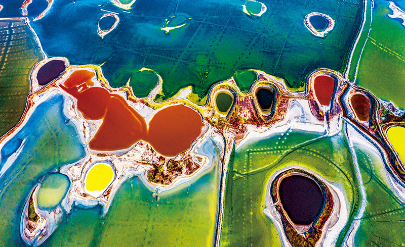 黨的十八大以來,水利部門深入實施水生態(tài)保護治理,推動江河湖泊面貌實現(xiàn)根本性改善。圖為山西運城鹽湖色彩斑斕的景觀(無人機照片)。 新華社發(fā) 薛俊/攝