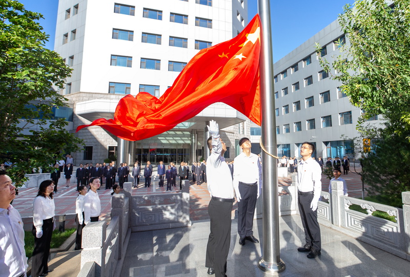儀式開始后,23名部機(jī)關(guān)先進(jìn)典型代表組成的升護(hù)旗方隊精神抖擻、步伐鏗鏘,護(hù)衛(wèi)國旗走向升旗臺。伴隨雄壯的《義勇軍進(jìn)行曲》,鮮艷的五星紅旗冉冉升起,在場全體干部職工整齊列隊、肅立致敬、齊唱國歌,向國旗行注目禮。
