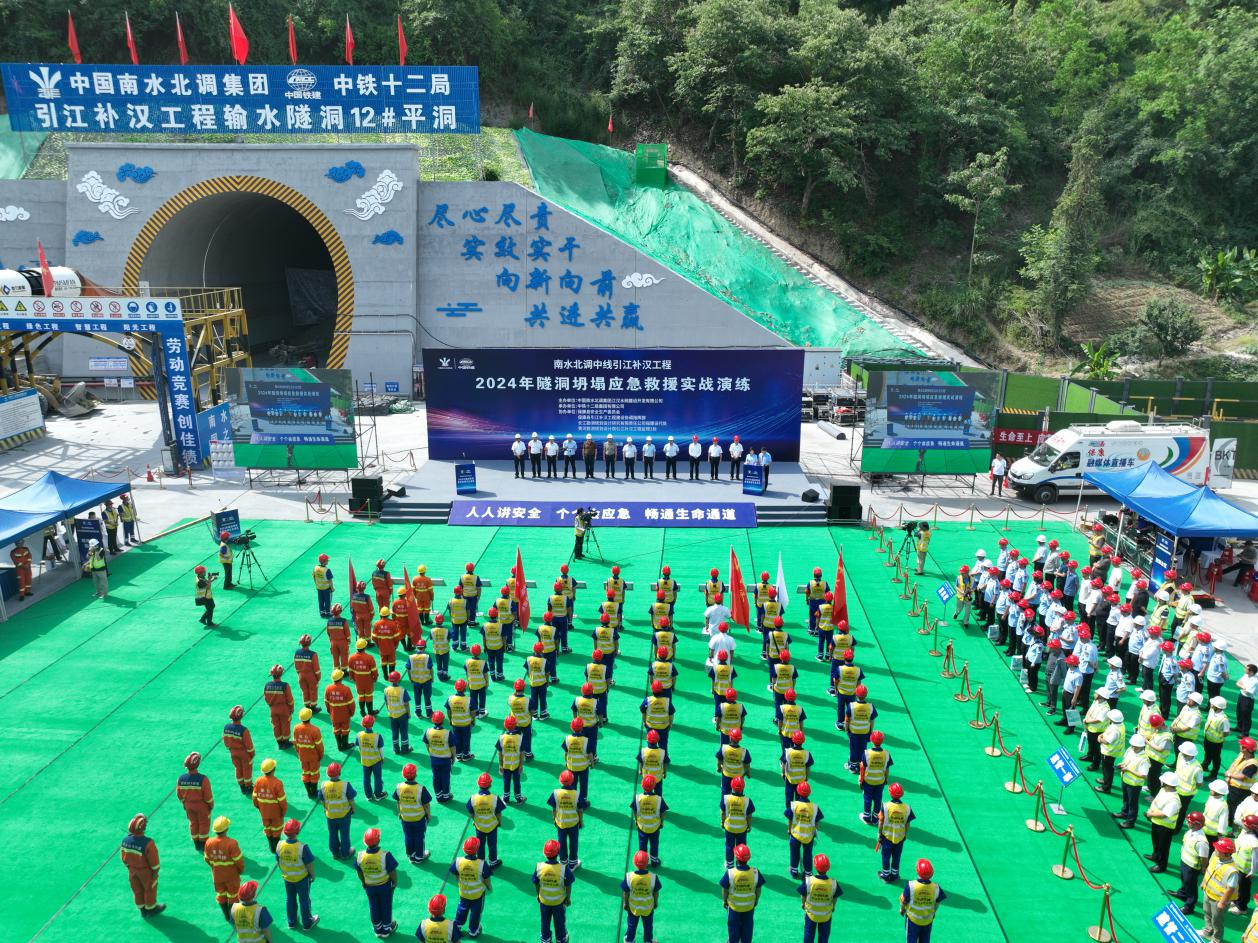 “導(dǎo)流渠水位超過20年一遇,由于進水口堵塞,水位不斷上升,即將漫過擋水墻,沖向豎井平臺,情況緊急,現(xiàn)已啟動項目應(yīng)急預(yù)案,請指示!”5月10日,一場防汛搶險應(yīng)急救援綜合演練在湖北省保康縣土建5標10號豎井上演。