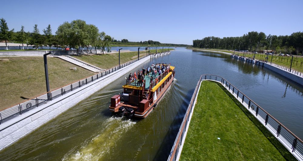 2022年6月24日,京杭大運河京冀段全線62公里實現(xiàn)游船通航。這是載著北京游客和建設(shè)者代表的游船通過船閘進(jìn)入京杭大運河河北段。新華社記者 李欣 攝